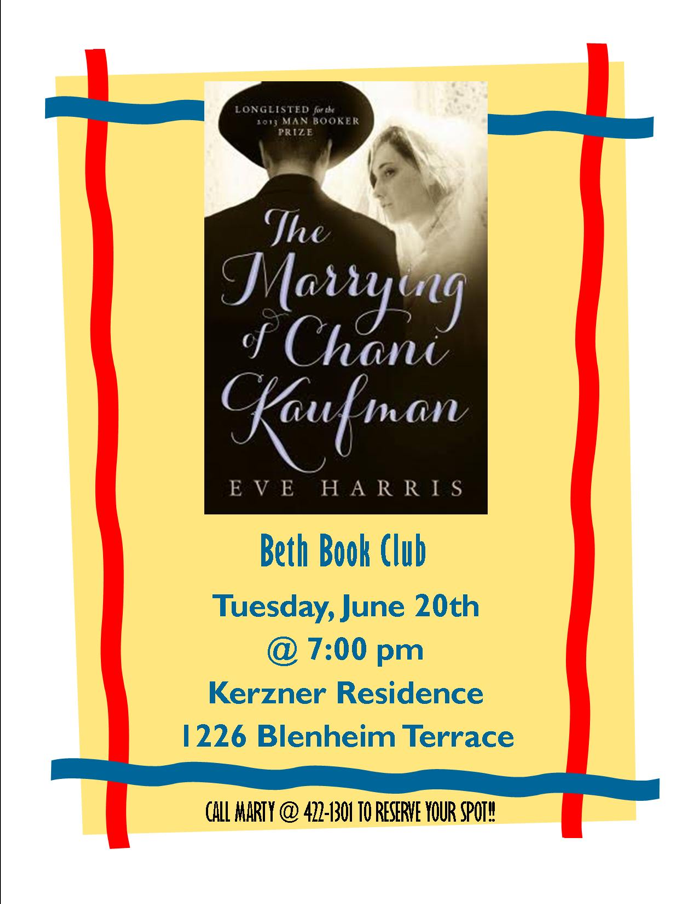The next book club meeting will take place at the home of Lisa and Yakov Kerzner, 1226 Blenheim Terrace, on Tuesday evening, June 20th at 7:00. The book chosen is “The Marrying of Chani Kaufman” by Eve Harris. Judith Goldberg will be the facilitator. Please contact the Beth office (902-422-1301) to reserve a spot.