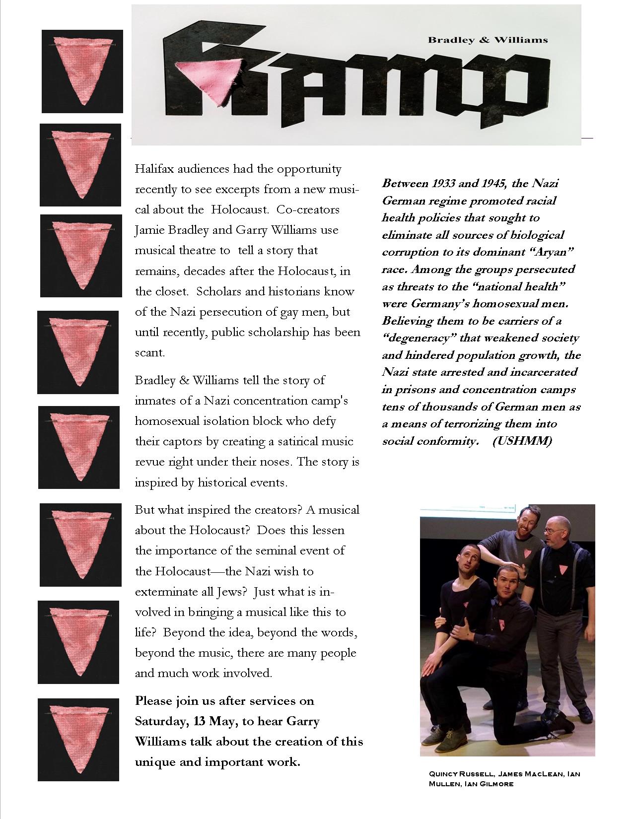 Halifax director, actor, & musician Garry Williams has teamed with Jamie Bradley to create a musical about the experience of gay men in concentration camps during the Holocaust. Excerpts from the production were presented at Halifax Central Library on April 24th. People have questioned the idea of a musical about the Holocaust, but in fact, this is not so very different from Jews who surreptitiously celebrated Shabbat or Jewish holidays in the camps. For gay men, many of whom were performers before being interned in camps, making music, even in these places, was a way to retain their humanity.