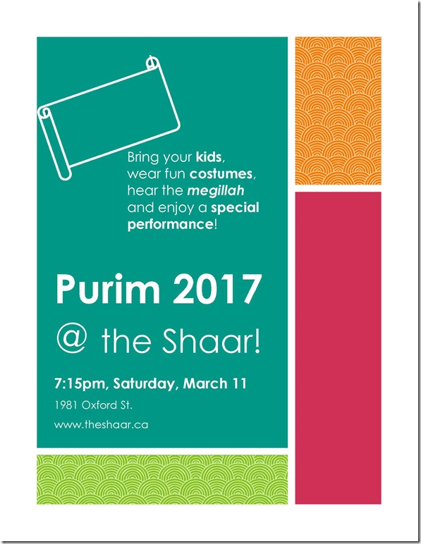 Get ready for Purim! We hope you can join us for our very special celebration at the Shaar, Saturday, March 11, 7:15pm