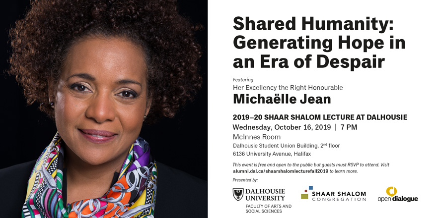 Please join us as we welcome the former Governor General of Canada, Her Excellency the Right Honourable Michaëlle Jean to deliver the 2019-20 Shaar Shalom Lecture at Dalhousie University.