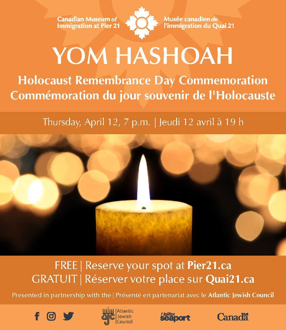 The AJC’s 2018 Yom HaShoah (Holocaust Remembrance Day) Ceremony in Halifax will take place this year on Thursday, April 12, at 7 PM, at Canadian Museum of Immigration at Pier 21.
