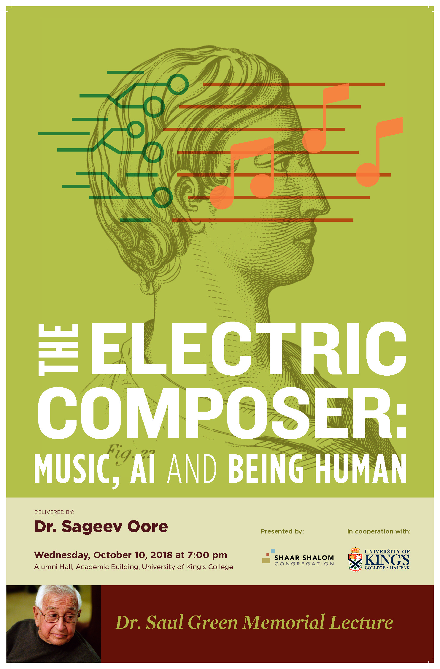 Alumni Hall, Academic Building, University of King's College 6350 Coburg Road, Halifax, NS, CanadaThis year’s lecture will be presented by Dr. Sageev Oore a professor in the Faculty of Computer Science at Dalhousie University and Visiting Faculty Research Scientist, Google Brain, Google Research (2016-2018). Dr. Oore’s lecture title is : The Electric Composer: Music, AI and being human. He will talk about neural networks learning to generate music…
