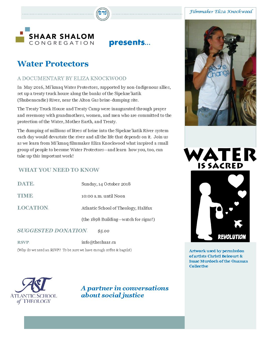 Atlantic School of Theology 660 Francklyn Street, Halifax, NS, CanadaDo we need Water Protectors in Nova Scotia? What are Water Protectors? These are the questions we will explore through a short film “Water Protectors” screened at a Shaar Breakfast Club. Following the film, a discussion will be facilitated by Eliza Knockwood, a Spiritual Mi’kmaq artist/film producer, and Bobbi Zahra. Eliza Knockwood will discuss her…
