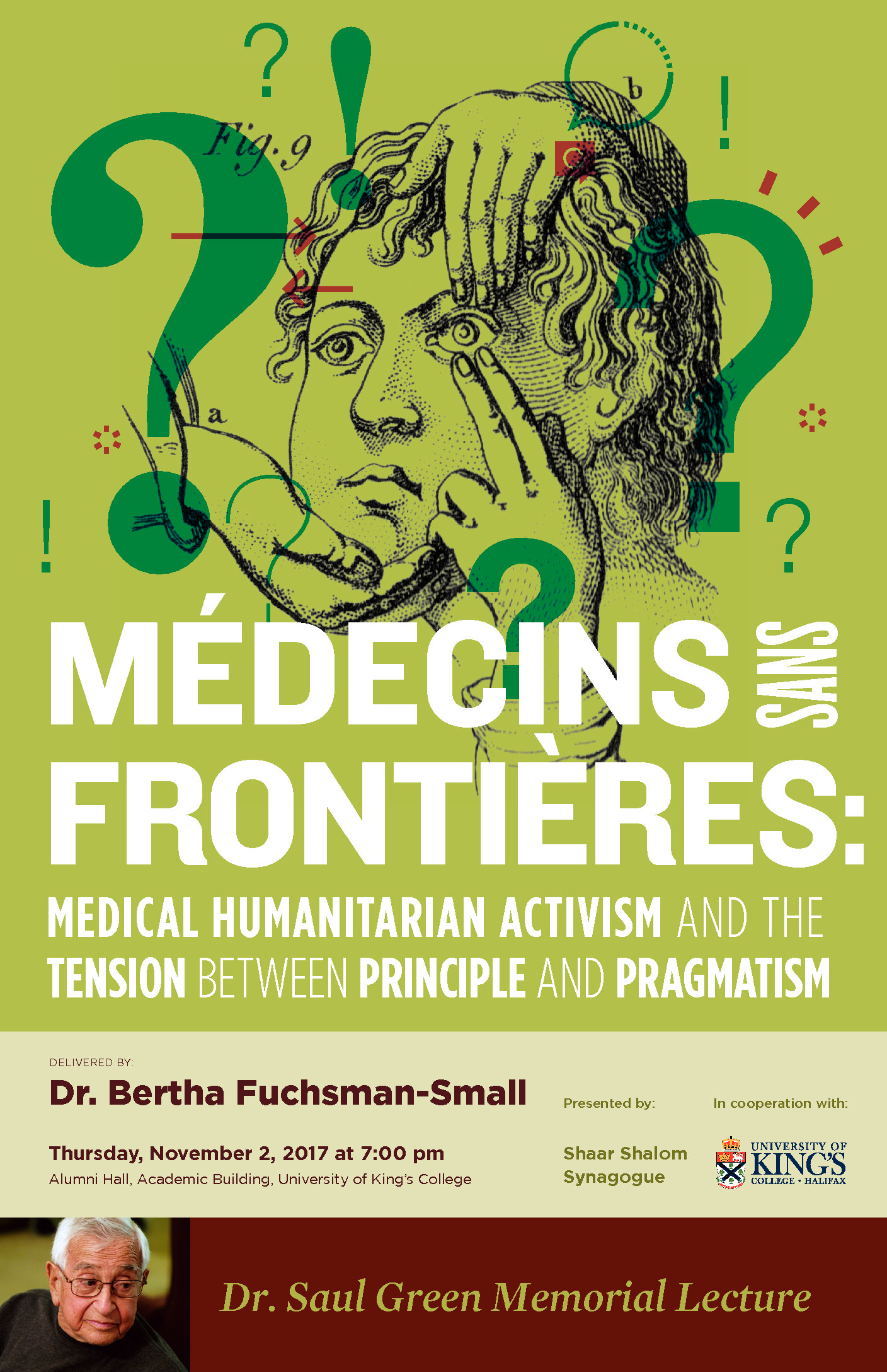 Alumni Hall, Academic Building, University of King's College 6350 Coburg Road, Halifax, NS, CanadaThis year's Dr. Saul Green Memorial Lecture will be delivered by Dr. Bertha Fuchsman-Small. Dr. Bertha Fuchsman-Small obtained a BA in History from Swarthmore College in Pennsylvania and a Doctor of Medicine degree from the University of Rochester. She is currently a family physician as well as an assistant professor with McGill University’s Faculty of…